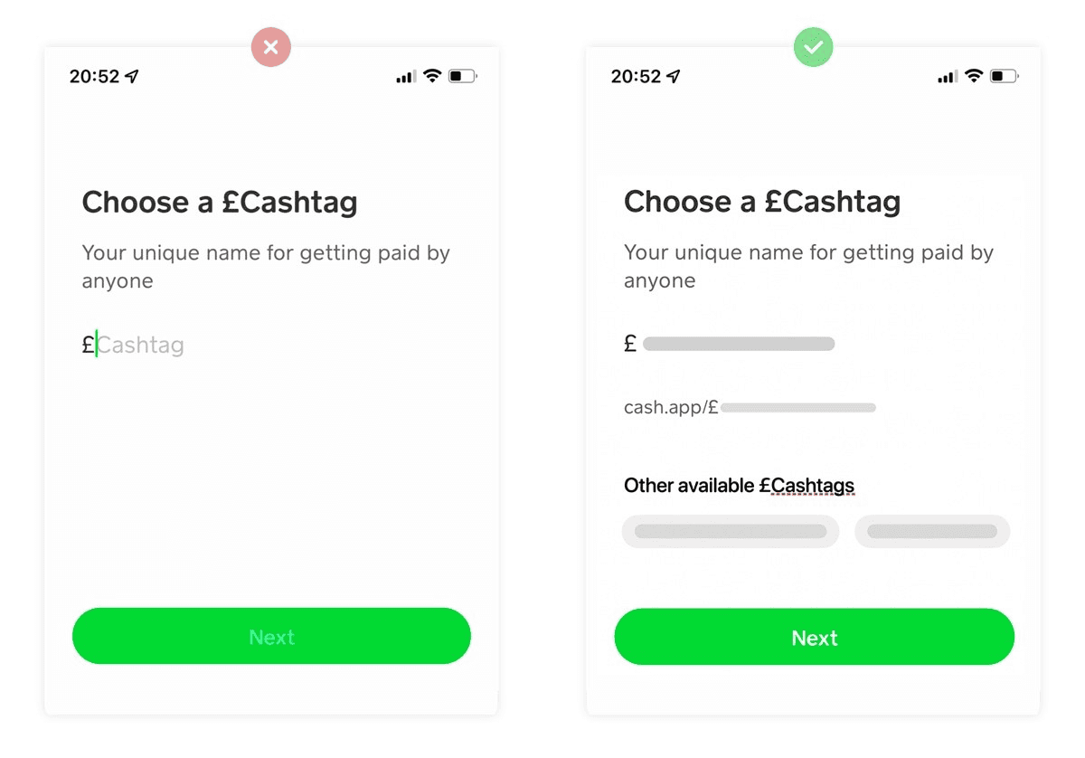 An example of this is showing the user a blank input field, and asking them to create their unique Cashtag.
