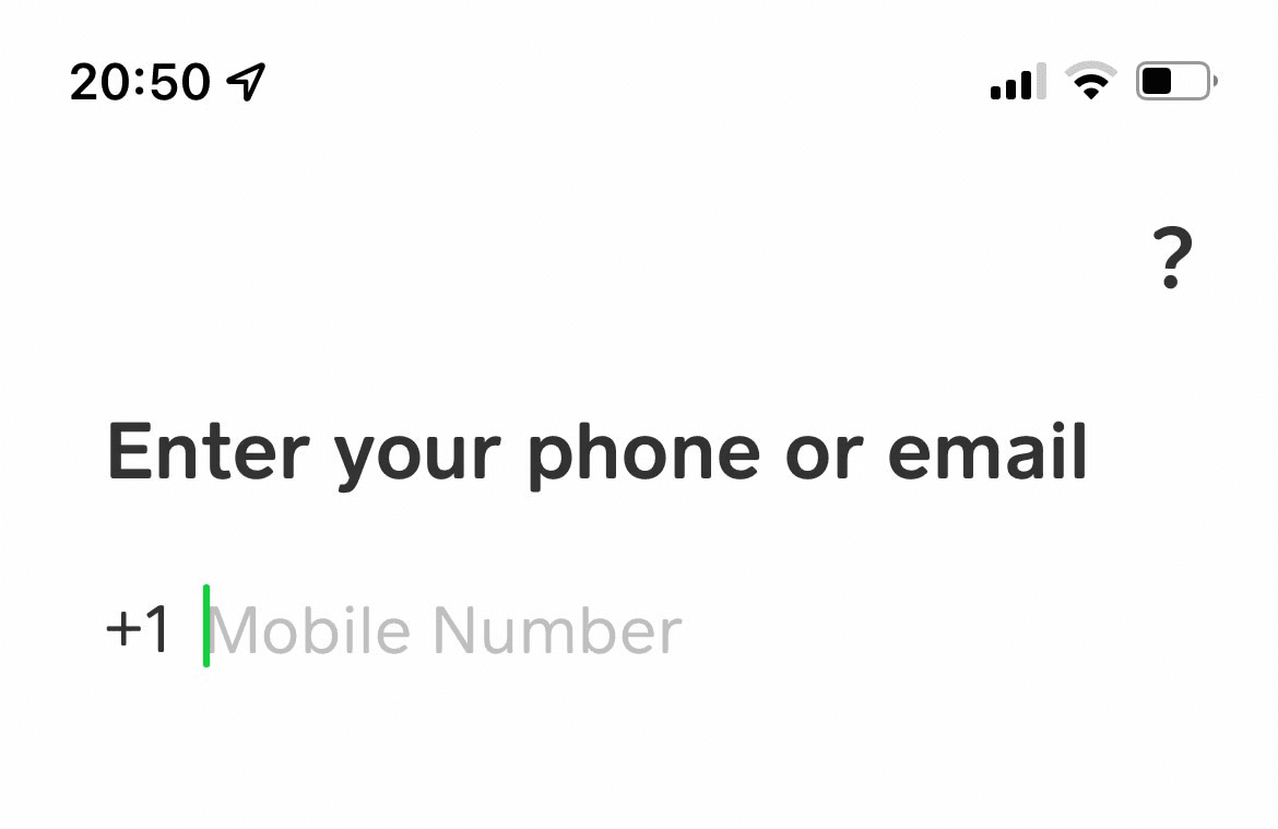 The very first screen on Cash App asks you for your phone number or email address. This works for both new and existing users.