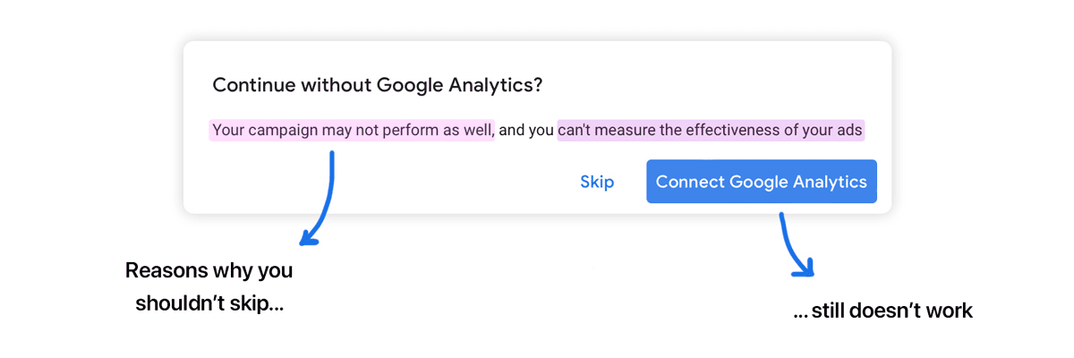When attempting to connect my Google Ad and Google Analytics accounts—i.e., to track the success of my campaign—I repeatedly hit an error.