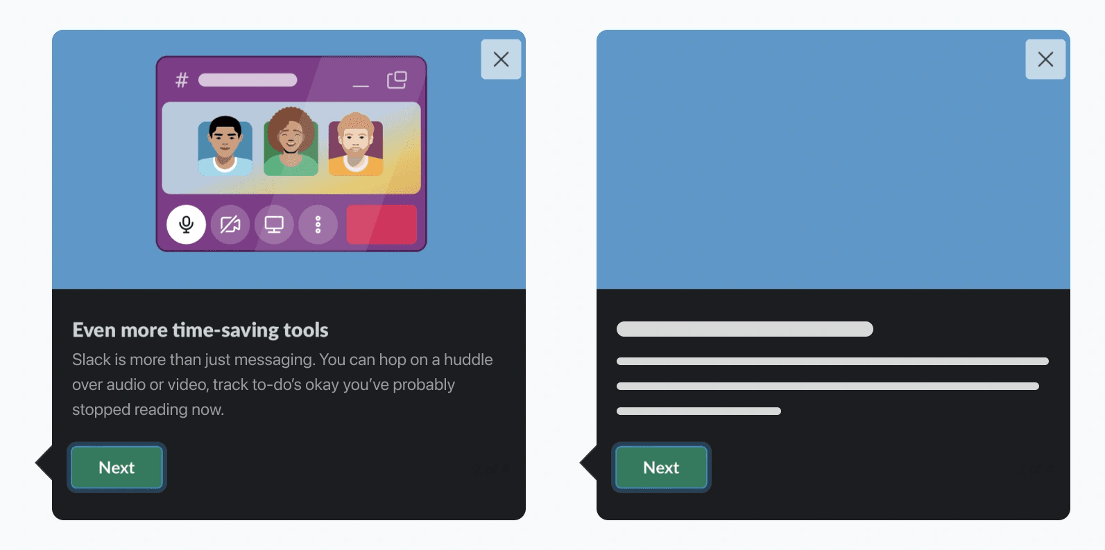 Slack's approach of incrementally exposing key interface sections during onboarding, is fantastic. It's absolutely something you should consider replicating.