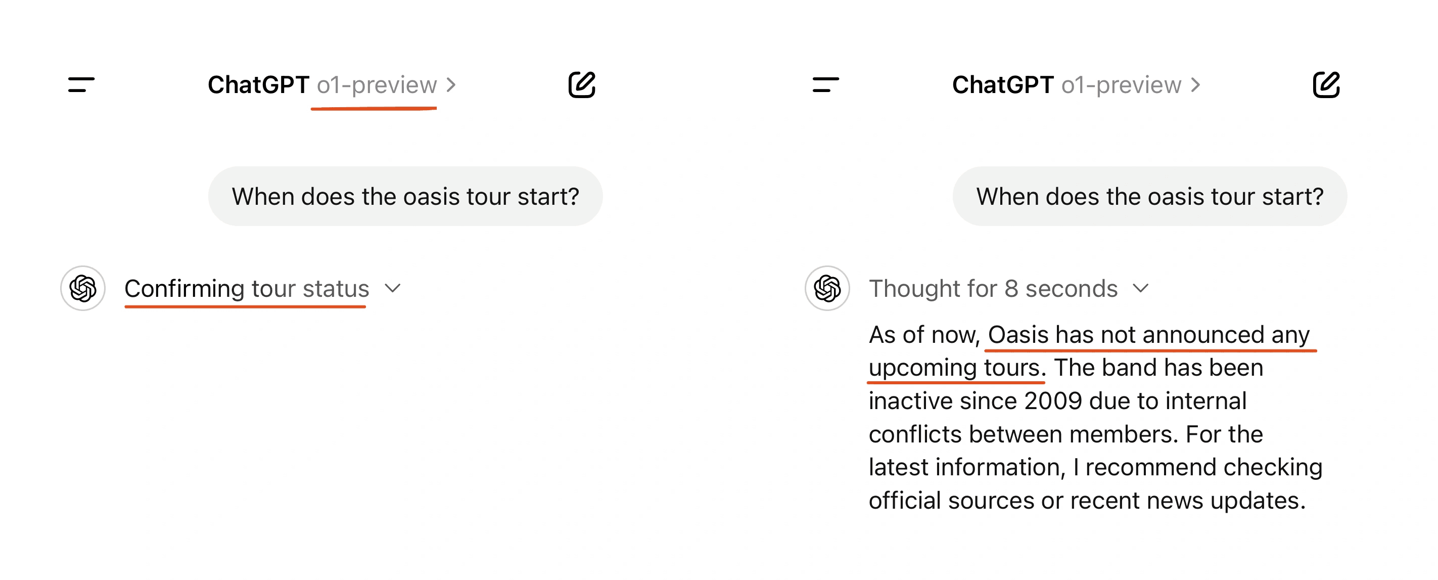 Using the Oasis example, o1 Preview will "confirm the tour status", and then get the answer wrong.