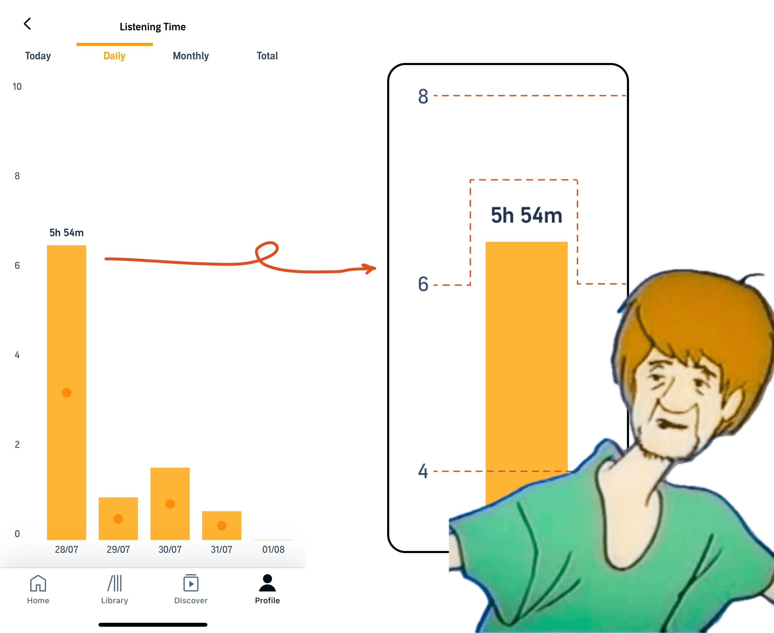 Often the charts are outright broken. For example, look at my daily listening time:
