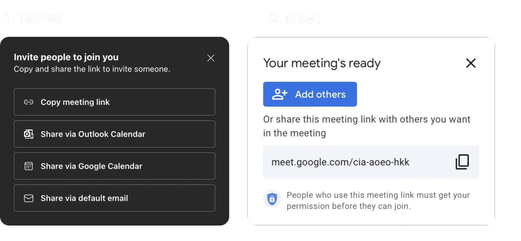 Both Teams and Meet recognise that the meeting is empty, and proactively suggest multiple methods of inviting participants.