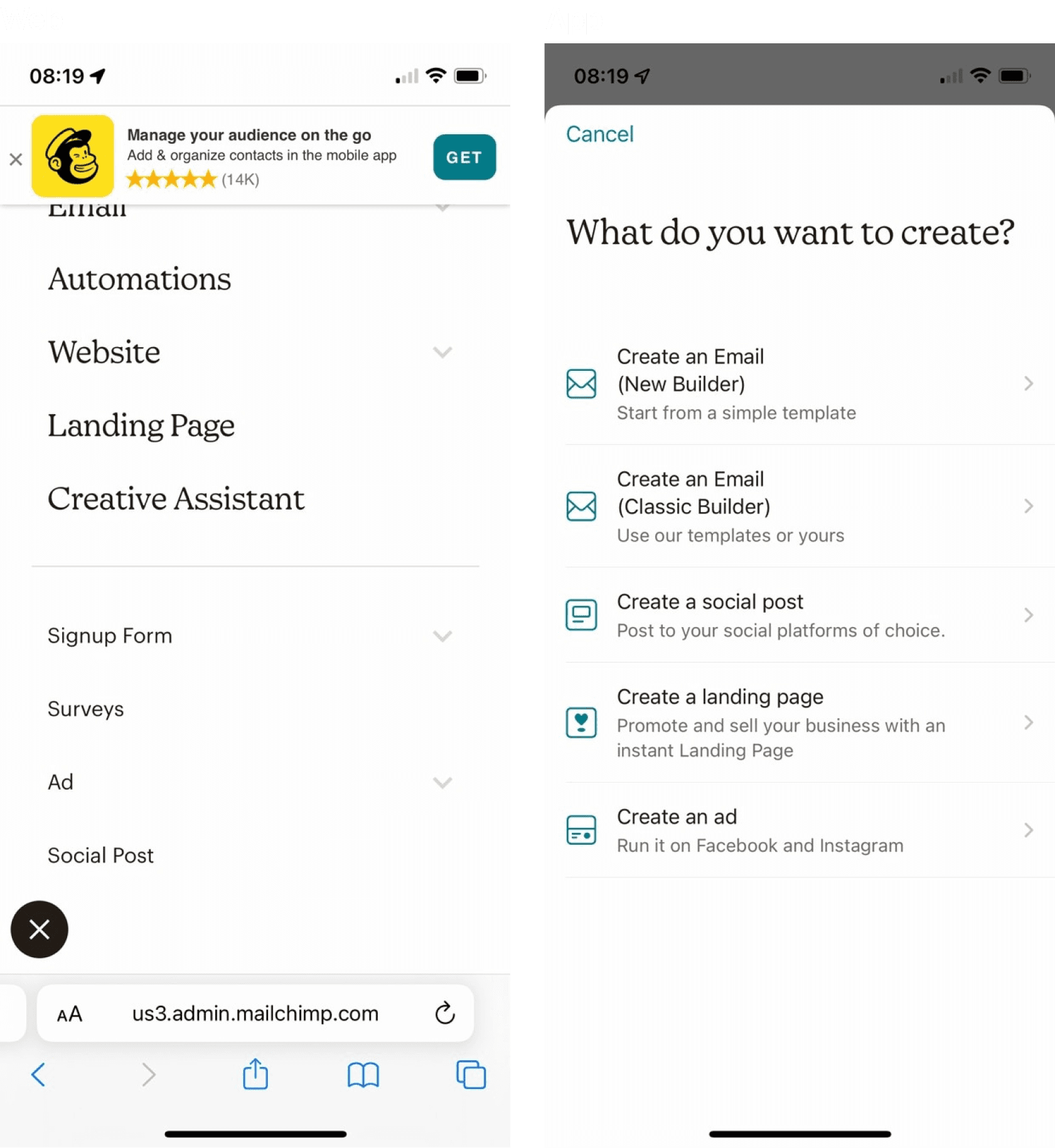 For example, here's the view after clicking 'create' on Mailchimp—a product which I believe broadly has a great UX.